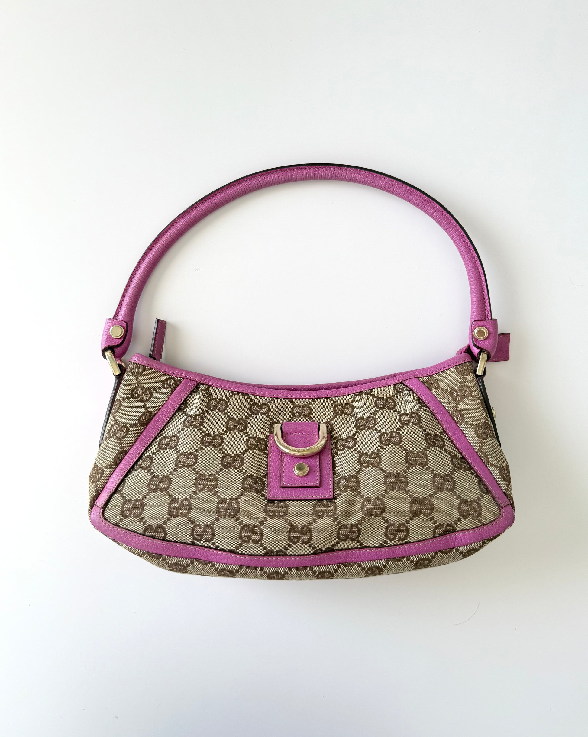 About: Vintage Gucci Pink Abbey Pochette Bag featuring a fuchsia pink leather trim and handle. Canvas lining with interior pocket and zip closure.